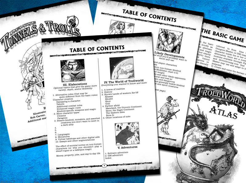 Many of you have asked for a peek at what the rules will be like and what will be in them. So today, the Fellowship is posting the recently finished Table of Contents! Now you can REALLY see what’s going to be in the book. Keep in mind, we may still make some changes here and there, so don’t hold us to it. Still – this is pretty close. One problem is the tabs. in WordPress, the tabs don’t work and I have been unable to manually add tabs or even extra spaces to make them stay, so you’ll have to look at this without the benefit of Liz’s tabs. Nonetheless, enjoy this peek at Deluxe Tunnels & Trolls Table of Contents and let us know what you think…