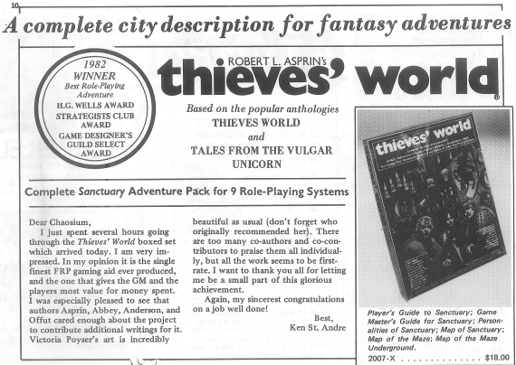 Pour la petite histoire, c’est en travaillant pour le projet de Thieves’ World, en 1981, que Ken St. Andre eut l’idée du citoyen pour la première fois. Ce projet se présentait sous la forme d’une boîte contenant plusieurs livres et cartes et présentant la ville de Sanctuary, un univers que plusieurs auteurs, dont certains connus (citons notamment, autour de Robert Asprin, Poul Anderson, Philip Jose Farmer, ou Marion Zimmer Bradley), ont pris pour cadre pour écrire au côté de grands rôlistes de l’époque (parmi lesquels Dave Arneson, Mar Miller, Stve Perrin, Greg Stafford, et bien sûr Ken St. Andre, qui apporta avec lui Victoria Poyser, l’une des illustratrices des règles de T&T).