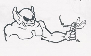 4°) Si la fée est acculée au combat contre un seul adversaire, la meilleure tactique consiste à éviter les coups. Les fées sont petites, mobiles et rapides. Esquiver les coups d’un grand balourd (c’est-à-dire tout adversaire plus grand qu’un hobbit) ne devrait pas être trop difficile. Une MEP de la DEX ou d’un talent d’esquive, et le tour est joué ! Par contre, toute esquive manquée risque bien d’être mortelle, mais c’est le prix à payer. 6°) Si la fée doit se battre seule contre plusieurs adversaires, la fuite est la meilleure solution. Si ce n’est pas possible, elle doit essayer au moins de les diviser ou de se déplacer dans un endroit où seul un adversaire à la fois pourra l’attaquer. Mieux vaut quand même diviser les adversaires afin de pouvoir plus facilement esquiver leurs coups. 7°) Donnez-lui du poison. En particulier, l’usage du venin d’araignée est particulièrement efficace contre un seul adversaire pas plus grand qu’un homme. Un petit dard enduit de ce venin fera des merveilles : attendez un tour de combat pour que son effet commence à se faire ressentir, deux tours pour que la victime soit complètement paralysée, puis vous aurez trois tours pour la liquider impunément. Votre fée pourrait même tenter le combat rapproché dès le 2e tour de combat (lorsque la victime voit son attaque totale réduite de moitié) en esquivant les coups de son adversaire. Pour réussir à esquiver l’attaque d’un adversaire sur lequel le venin d’araignée a commencé à prendre effet, la MEP de la VIT ne devrait pas être très élevée. 8°) utilisez vos points d’expérience pour augmenter la CONS de votre fée. Bien sûr, vous n’en ferez pas tout de suite un super-champion, mais au moins, vous lui éviterez de mourir lamentablement d’une simple morsure de rat. De toute manière, vous aurez déjà compris qu’il faut éviter au maximum d’exposer votre fée. 9°) Tendez des pièges : flaques d’huile, chausse-trapes, fils-pièges, etc. sont autant d’obstacles à mettre dans les pattes de vos ennemis et dans lesquels vous ne risquez pas d’empêtrer votre fée. Si elle vient tenter ou narguer un groupe d’adversaires, il y a de bonnes chances pour que ceux-ci aient le regard tourné vers elle, c’est-à-dire vers le haut, et non vers le bas… Si votre fée n’a pas eu le temps ou les moyens de tendre des pièges, elle peut en revanche profiter de la configuration des lieux et faire courir ses poursuivants tout droit dans une fosse ou vers le bord d’une falaise, sans compter l’inévitable lac ou la très populaire rivière. Pendant que ses adversaires pataugeront (ou couleront, s’ils ne savent pas nager), votre fée aura tout loisir de les mitrailler de projectiles. Cette tactique n’est pas mal non plus pour forcer des adversaires à retirer leur trop encombrante armure 🙂 10°) Attention aux toiles d’araignée et aux adversaires volants, qui peuvent venir tout gâcher… Un mot d’ordre : pensez petit, pensez vite, pensez en 3D !