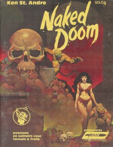Le titre est doublement évocateur. Votre personnage est condamné, probablement pour des broutilles, par la justice expéditive de Khazan, la capitale de l’empire éponyme. Il est jeté dans les catacombes qui s’étendent sous la cité et, pour corser encore les choses, doit réussir à s’en sortir dans le plus simple appareil ! Autant dire qu’il est condamné à mort, ou peu s’en faut. Néanmoins, votre personnage a encore une mince chance de survie et tout porte à croire que si jamais il parvient à réchapper au dépouillement dernier, il sera plus puissant qu’il ne l’a jamais été. Vous verrez que ce solo comporte un point de passage vers un autre solo de Ken St. Andre : Deathtrap Equalizer. Ce solo a été traduit en français dans les années 1980 sous le nom l’Harmonisateur de pièges, et vous pourrez prochainement le télécharger gratuitement sur le site du forum